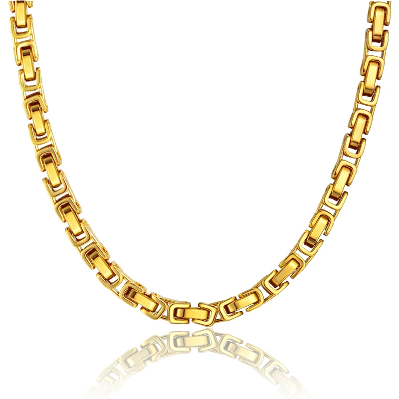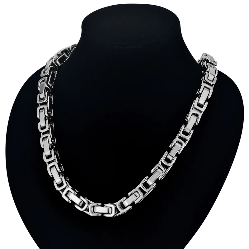 A bold statement piece for men: this thick 8MM Byzantine link chain comes in gold or silver tones, crafted from durable stainless steel. Heavy, stylish, and perfect for everyday wear or punk-inspired looks.